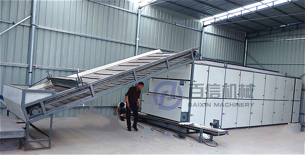 山藥收獲后經過清洗、切片才可以進入烘干環(huán)節(jié),山藥烘干根據(jù)熱源不同分為網帶烘干和熱泵烘干房烘干。山藥片烘干工程就是通過送熱風蒸發(fā)山藥片的多余水分,新鮮的山藥片在熱風中水分蒸發(fā)為水蒸氣排除,達到烘干的目的。